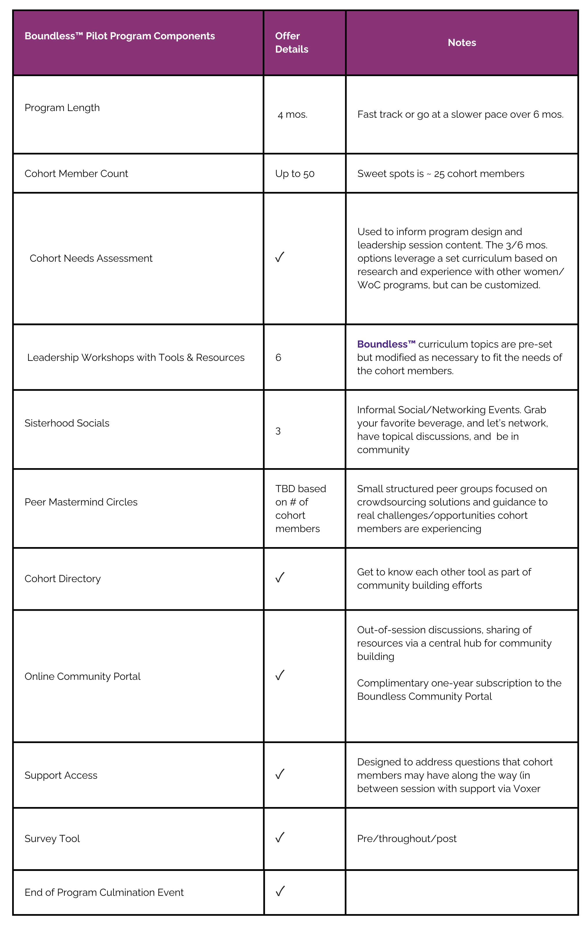 By fostering confidence, leadership development, well-being, and community, Boundless equips women to thrive. Participants are equipped to break through barriers, create meaningful impact, and confidently navigate their personal and professional growth. The program fosters solidarity and support, enabling women to lead with purpose, build resilience, and embrace their full potential within a vibrant, affirming group. Boundless offers a dynamic space where WoC women are empowered and inspired to drive change without bounds.