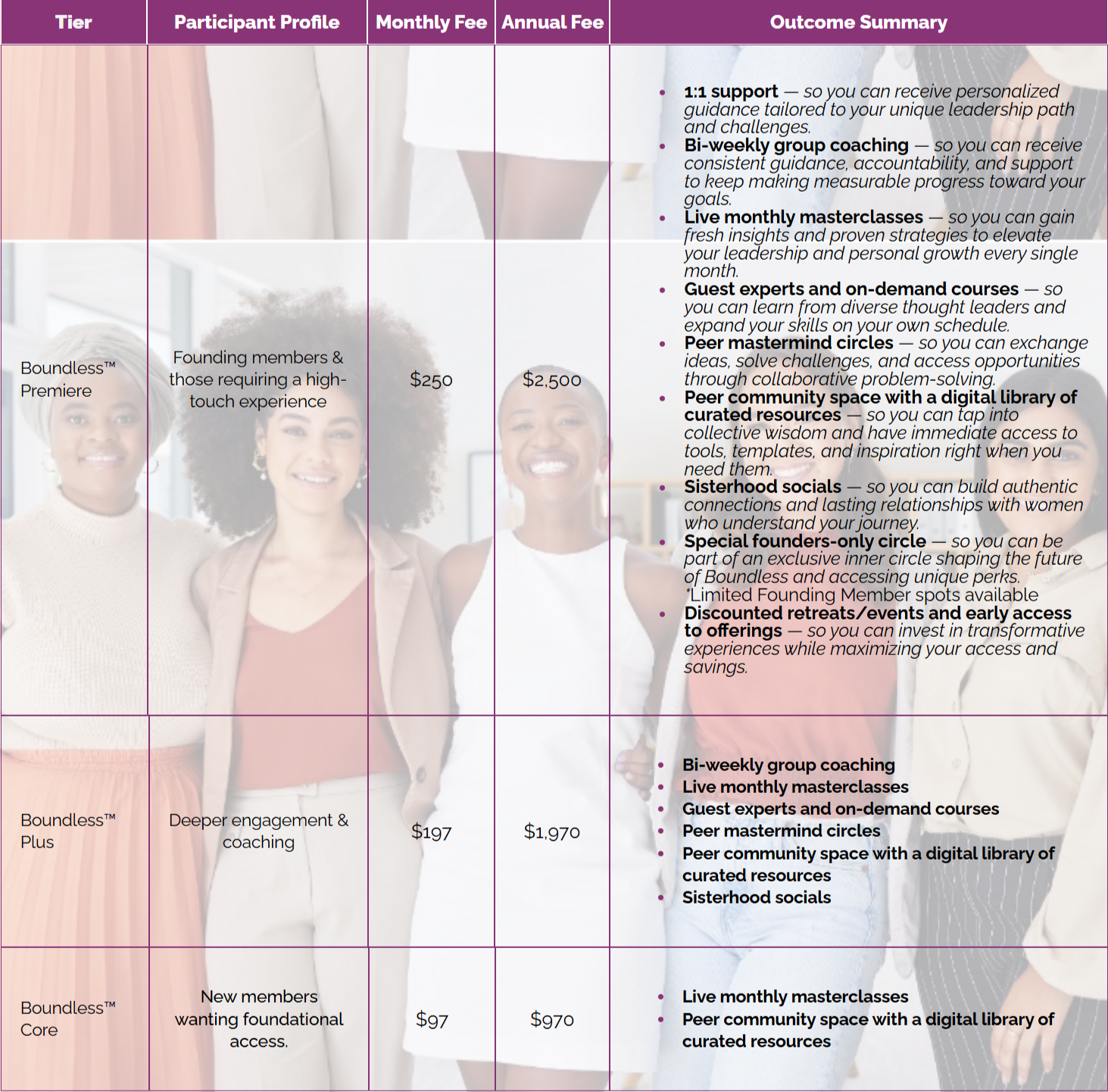 Boundless membership is evergreen with ongoing enrollment, along with occassional strategically times, curated launch campaigns with special offers. However, this initial launch is the only opportunity to be a part of the Founding cohort whereby exclusive early access pricing, founding member recognition, input into the experience design, and other special benefits are available as outlined here for those committing to the Boundless Premier level. It's important to note that during this initial enrollment period, introductory pricing has been assigned. We reserve the right to increase membership pricing during future launches. For those who signed up under this current pricing model, your fee is locked in and will remain unchanged during your first 12-month membership.